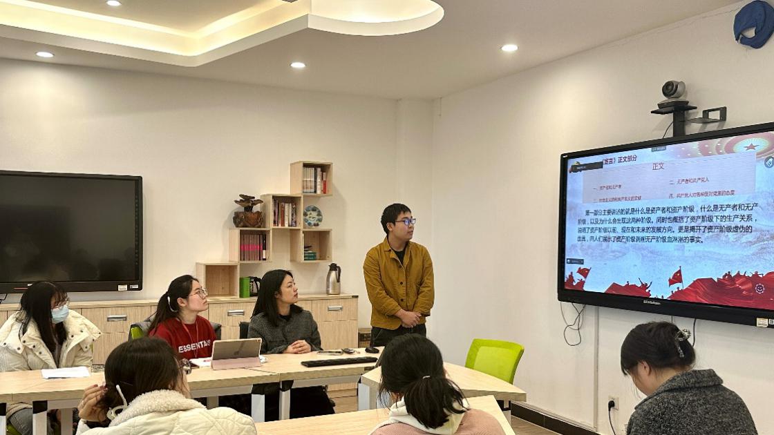 本科生食工第一党支部姜浩楠同志分享了共产党宣言学习心得,和大家交流了共产党宣言中的各部分内容以及其中提到的理论知识。他提出:“共产党宣言是马克思主义最广为流传的著作,是马克思主义者的入门读物,更是我们作为共青团员和共产党员的必修课。只有学习马克思主义经典著作,才能真正了解共产主义的根本原理,才能更好地去进行实践活动。”