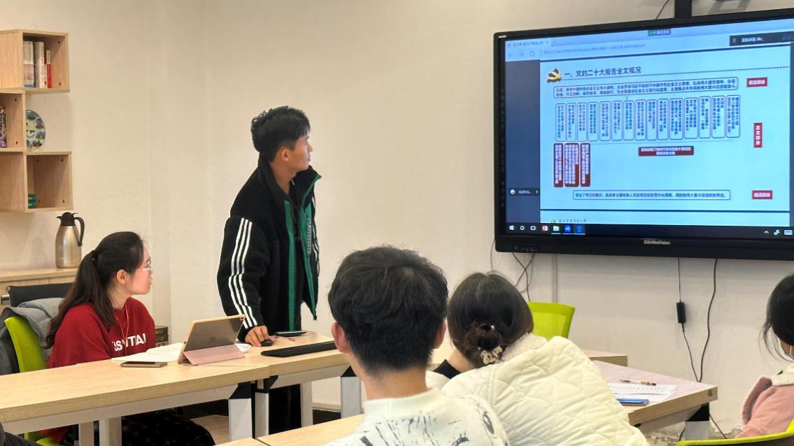 本科生卓越国际第五党支部张文博同志分享了党的二十大报告学习心得,和大家交流了“三件大事”、“第二个答案”、“六个必须坚持”等报告中的新表述新概括新论断。他表示:“广大青年要坚定不移听党话、跟党走,怀抱梦想又脚踏实地,敢想敢为又善作善成,立志做有理想、敢担当、能吃苦、肯奋斗的新时代好青年,让青春在全面建设社会主义现代化国家的火热实践中绽放绚丽之花。”