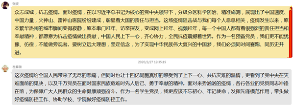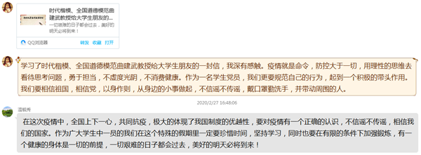 党员张芯蕊表示:“通过本次学习,我有一下几点收获:(1)在国家面临各种重大事件时,党员一定要发挥好先锋模范作用,只有这样才能体现中国共产党的宗旨,也只有这样才能高效快速地应对各种问题;(2)通过这次疫情处置也更能体现中国共产党的先进性,统观其他国家的应对效率、强度都说明了这一点;(3)这次疫情也更让我为自己是共产党员而自豪,能够加入到这个一心为人民的党组织我觉得十分光荣!最后,我相信在共产党的领导下,在全国各族人民的努力下,我们必定战胜疫情,恢复安稳和乐的生活!”党员温毓秀谈到:“在这次疫情中,全国上下一心,共同抗‘疫’,极大的体现了我国制度的优越性,要对疫情有一个正确的认识,不信谣不传谣,相信我们的国家。作为广老员工中一员的我们在这个特殊的假期里一定要珍惜时间,坚持学习,同时也要在有限的条件下加强锻炼,有一个健康的身体是一切的前提,一切艰难的日子都会过去,美好的明天必将到来!”党员郑路瑶说道:“通过本次学习,感触颇深,看了有关疫情的新闻后,我了解到这次疫情的严重性。在这疫情肆虐的非常时期,最辛苦的是冒着被感染的风险在救病治灾的白衣天使。其次,共同抗‘疫’,人人有责。降低感染冠状病毒风险的措施。就在科学技术快速发展的今天,我相信不久就可以解救痛苦的病人。让我们共同抗‘疫’,对自己和家人的健康状况提高警觉,从身边的小事做起,关注疫情,了解疫情,共同抗‘疫’。中国加油,武汉加油!”