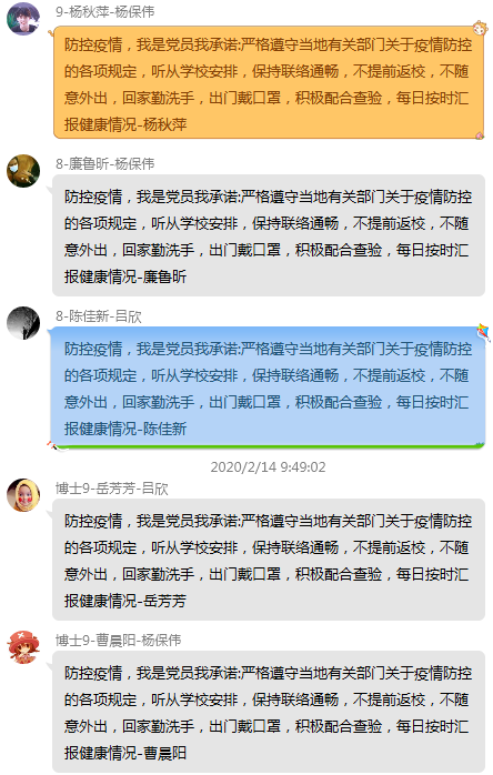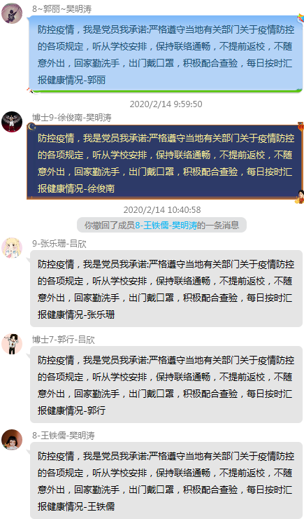 为落实公司党委提出的“在疫情防控阻击战中充分发挥基层党组织战斗堡垒作用和共产党员先锋模范作用”要求,全面开展公司“亮身份·践承诺·树形象”暨“党旗飘扬,共同战疫”主题实践活动,研究生食品微生物支部于2月14日在QQ群开展“防控疫情,我是党员我承诺”活动。