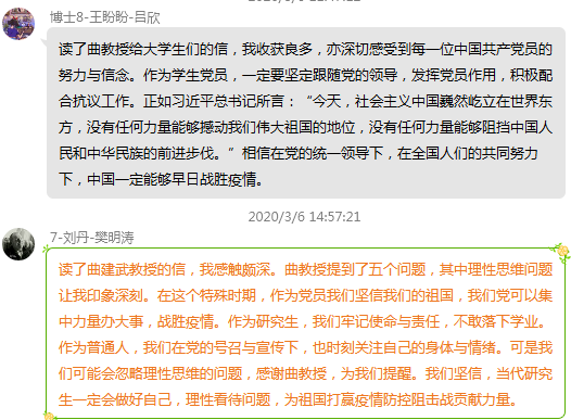 为强化研究生党支部战斗堡垒作用和研究生党员的先锋模范作用,强化政治理论学习,研究生食品微生物支部在QQ群中集中学习《曲建武教授给老员工朋友的一封信》,使大家正确认识这次疫情,保持良好的政治意识,发挥党员的责任担当。支部各个党员看后,积极讨论学习后的收获。