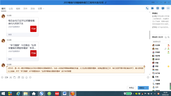 3月5日是一年一度的学雷锋纪念日和中国青年志愿者服务日。为进一步掀起学雷锋做雷锋的热潮,大力弘扬志愿服务精神,助推疫情防控工作,研究生粮食与油脂植物蛋白工程党支部依托QQ群以及“学习强国”APP开展集体学习。
