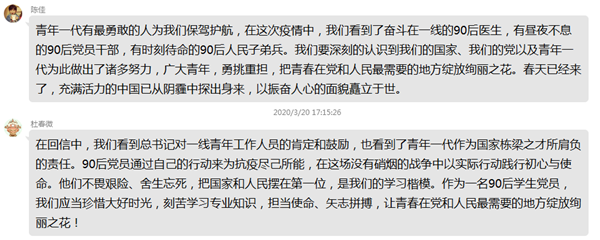 董瑶瑶说道:“在这次疫情防控中,让我们看到了党员的先进思想,先进力量。许多党员同志都尽自己所能协助社区人民,帮忙测体温,登记居民出入情况,宣传疫情的严峻性,帮疑似患者买菜扔垃圾等。我们积极应对这次疾病考验,万众一心。中国控制住了疫情,就是对世界重大贡献,感谢为这场战“疫”奉献的所有人,让我们期盼春暖花开时的相逢。”