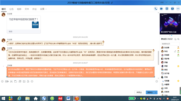 3月15日,习近平总书记给北京大学援鄂医疗队全体“90后”党员回信,向他们和奋斗在疫情防控各条战线上的广大青年致以诚挚的问候,勉励广大青年不惧风雨、勇挑重担,让青春在党和人民最需要的地方绽放绚丽之花。总书记的深情寄语和殷切嘱托,也同样激励着我们员工党员。研究生粮食与油脂植物蛋白工程党支部通过QQ群线上学习“习近平给北京大学援鄂医疗队全体‘90后’党员的回信”。