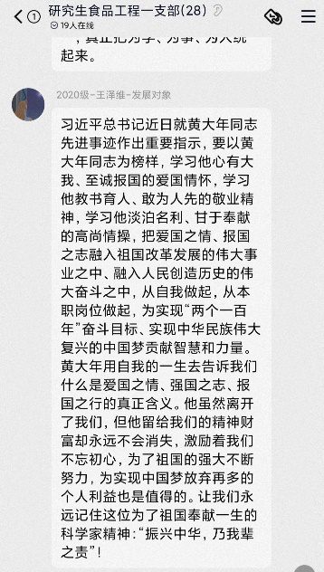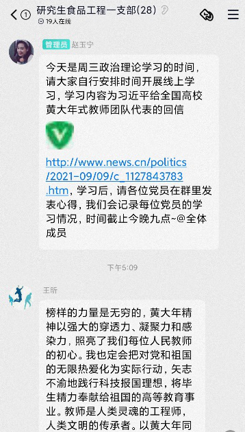 2021年9月29日星期三,研究生食品工程第一党支部开展本周政治理论学习。本次政治理论学习主题为:学习“学习习近平总书记给全国高校黄大年式教师团队代表的回信”,活动由支部成员赵玉宁主持,支部全体党员积极参与。