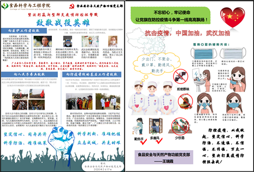 为贯彻落实习近平总书记关于新型冠状病毒感染的肺炎疫情的重要讲话要求,落实公司党委提出的“在疫情防控阻击战中充分发挥基层党组织战斗堡垒作用和共产党员先锋模范作用”要求,并根据公司党委发布的《关于在全体学工干部和员工党员开展“亮身份•践承诺•树形象”暨“党旗飘扬,共同战疫”主题实践活动的通知》,食品安全与天然产物功能党支部于2月16日到19日开展了“武汉加油,中国加油”、“致敬战役英雄”、“防控疫情从我做起”等与疫情防控相关的主题宣传活动。支部党员积极参与,通过手抄报、宣传海报、宣传PPT的形式进行疫情防控宣传。
