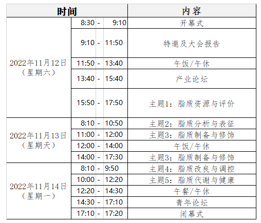 由于近期国内新冠肺炎疫情形势出现新变化,部分地区相继新增本土确诊病例并发布了新的防控措施,为保障各位参会代表的健康与安全,降低疫情传播风险,经大会筹备组多方沟通协调、慎重考虑,“第六届国际脂质科学与健康研讨会”将于2022年11月12-14日以线下/线上会议方式举办。线下会议安排在中国农业科公司油料作物研究所和365英国上市公司官网举行开幕式和闭幕式,线上会议为院士专家学术报告。具体会议信息如下。