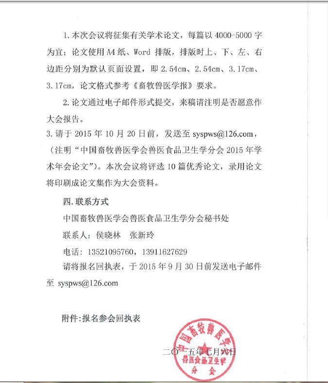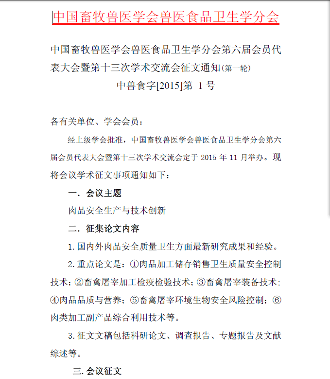 中国畜牧兽医学会兽医食品卫生学分会第六届会员代表大会暨第十三次学术交流会征文