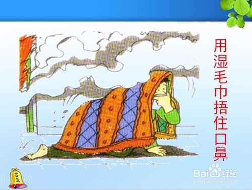 第六诀:简易防护,蒙鼻匍匐。逃生时经过充满烟雾的路线,要防止烟雾中毒、预防窒息。为了防止火场浓烟呛入,可采用毛巾、口罩蒙鼻,匍匐撤离的办法。烟气较空气轻而飘于上部,贴近地面撤离是避免烟气吸入、滤去毒气的最佳方法。穿过烟火封锁区,应配戴防毒面具、头盔、阻燃隔热服等护具,如果没有这些护具,那么可向头部、身上浇冷水或用湿毛巾、湿棉被、湿毯子等将头、身裹好,再冲出去。请记住:多件防护工具在手,总比赤手空拳好。