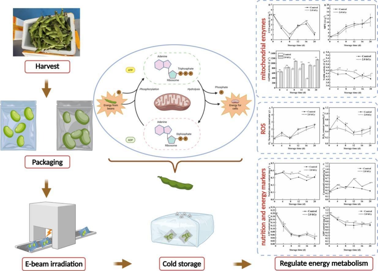 研究基于气调包装(MAP)对果蔬的气体环境调控作用以及电子束辐照(EBI)在食品保鲜中的物理优势,系统探讨了该协同方法对维持鲜食蚕豆贮藏品质的应用潜力。结果表明,在4±1℃贮藏条件下,适宜的EBI处理(2.0 kGy)结合PE 0.03 mm MAP能显著延缓蚕豆的色泽劣变、质地软化及营养品质下降。该处理有效抑制了呼吸代谢和脂质过氧化,维持了细胞膜完整性,同时显著降低了微生物总数,提高了贮藏安全性。