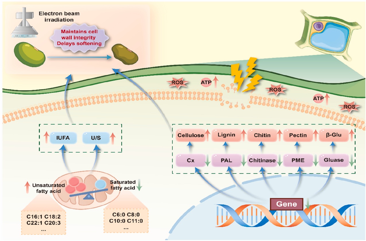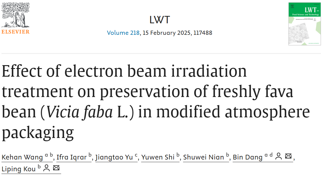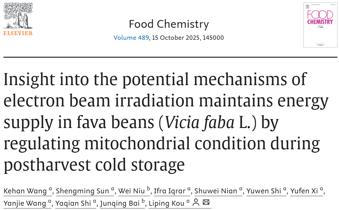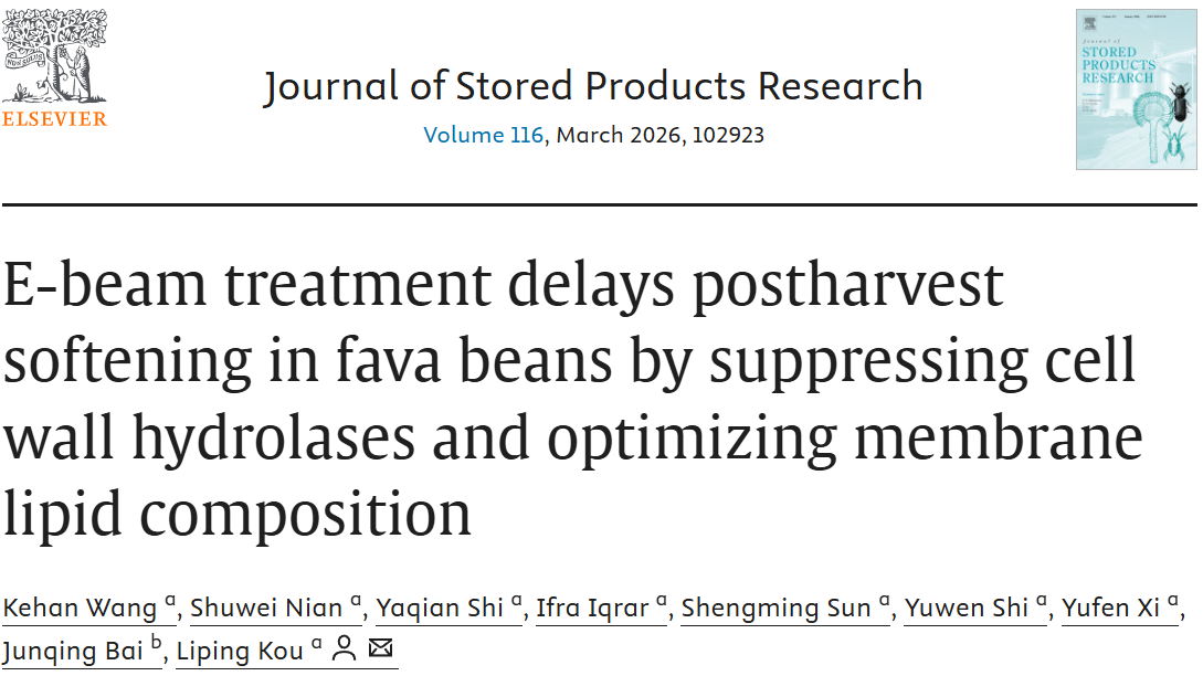 近期,公司果蔬贮藏与加工团队寇莉萍课题组在蚕豆贮藏保鲜方面取得新进展,相关成果相继发表于国际权威期刊《LWT》、《Food Chemistry》和《Journal of Stored Products Research》上,题目分别为“Effect of electron beam irradiation treatment on preservation of freshly fava bean (Vicia faba L.) in modified atmosphere packaging”,“Insight into the potential mechanisms of electron beam irradiation maintains energy supply in fava beans (Vicia faba L.) by regulating mitochondrial condition during postharvest cold storage”和“E-beam treatment delays postharvest softening in fava beans by suppressing cell wall hydrolases and optimizing membrane lipid composition”。公司2023级硕士研究生王可翰为第一作者,寇莉萍副教授为通讯作者。