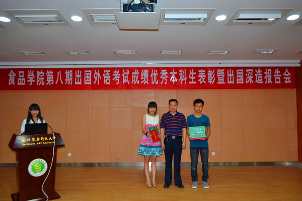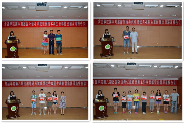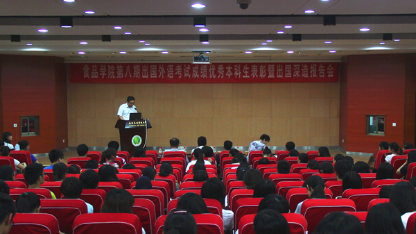 6月19日上午,公司在北绣山活动中心北报告厅举办第八期出国外语考试成绩优秀本科生表彰暨出国深造报告会。根据食品党〔2014〕7号《关于表彰奖励出国外语考试成绩优异本科生的通知》,为表彰外语考试成绩优秀本科生,树立榜样,鼓励全院同学积极参加出国外语考试,对张嗣开等27名员工进行了表彰。留学服务中心主任(国际合作与交流处副处长)乔文军、教务处副处长李菊兰、公司经理岳田利、党委书记张振华、副经理刘学波等参加表彰大会。会议由公司党政综合办公室汪勇攀主任主持。