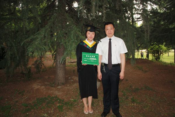 岳田利经理与食工105班窦芳同学在认养树木前合影