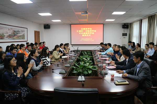 5月26日,公司达能奖学金、汇湘轩-刘敏奖学金、中农盛源奖学金颁奖典礼在365上市集团官网A215会议室举行。达能(陕西)食品饮料有限公司总监胥勋述、人事行政经理马洁、陕西中农盛源物流有限公司总经理翟源彪、校员工处、基金会、机电公司、365上市集团官网负责人参加会议。颁奖典礼由公司党委副书记汪勇攀主持。