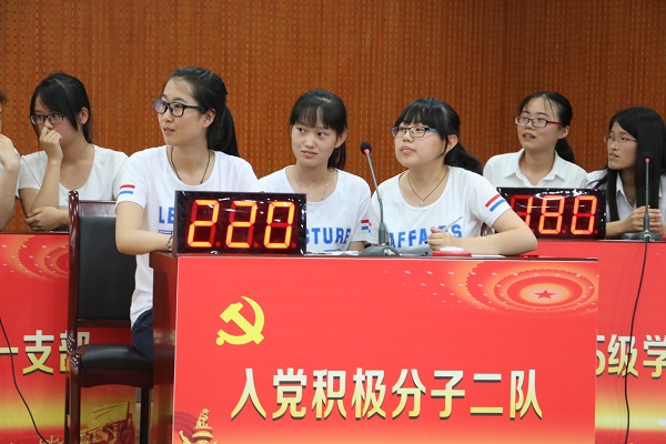 不惧失败,迎难而上。比赛过程中,入党积极分子的两支队伍齐头并进、占据优势,其他队伍比分落后时也不畏惧,勇于求进。在风险竞答环节中,六支队伍互不相让,纷纷挑战难度系数最高的试题进行作答,面对落后的比分表现出破 釜沉舟的勇气和魄力。其中入党积极分子分子二队的选手曹家悦,完整的回答出八条中国共产党廉洁自律准则的内容以及党的新闻舆论工作的职责和使命,赢得台下所有老师和同学的喝彩与掌声。