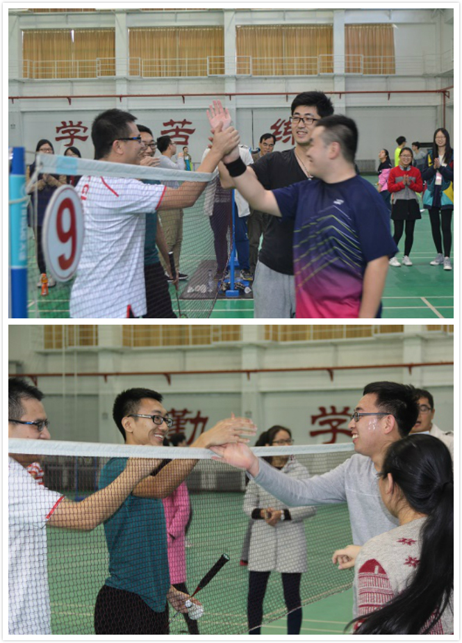 在两天的比赛中,“师生羽共”赛场堪称精彩绝伦。球馆里时而因为一记杀球掌声迭起,时而由于赛事紧张而鸦雀无声。尤其是袁亚宏老师与王昕同学组成的队伍巾帼不让须眉,赛事伊始便迅速投入比赛的紧张状态,配合默契、挥拍流畅、定点精准、扣球犀利,赢得了场下观众的阵阵喝彩。最终经过激烈的角逐,袁亚宏老师与王昕同学挺进四强。袁亚宏老师感叹道,这次活动很有意思,第一次与员工配对参加比赛。在周末举办,不但可以锻炼研究生身体还可以缓解研究生科研中遇到的压力。赛后大家热情未减,2014级博士研究生王欣与公司2013级本科生常博组成男双挑战葛武鹏老师与王玉堂老师,表演赛精彩纷呈,赛场气氛空前热烈。