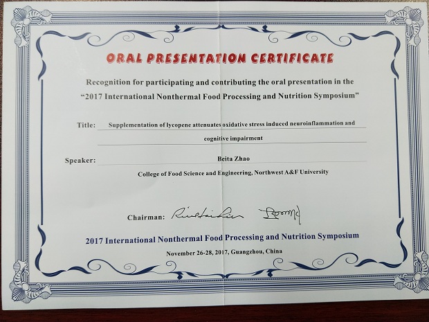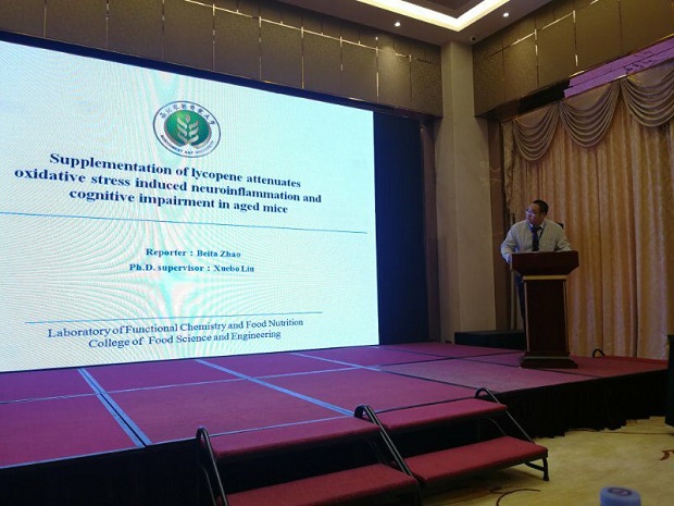 博士研究生赵贝塔在会议研究生论坛上作了题为“Supplementation of lycopene attenuates oxidative stress induced neuroinflammation and cognitive impairment”的学术报告,并荣获 “Best oral presentation award”奖项。据悉,研究生论坛有来自14 个高校的16名博、硕士研究生进行全英文汇报,获“Best oral presentation award”奖的共有5名。