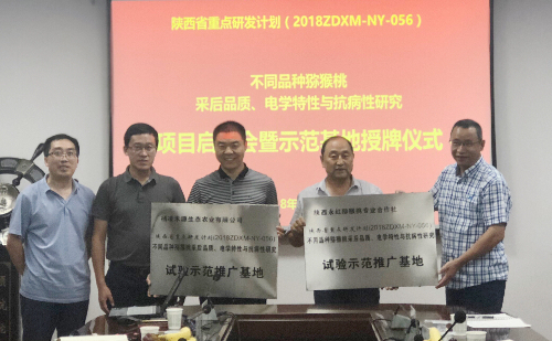 交流结束后,刘学波、刘占德教授代表项目组为该项目试验示范推广基地陕西永红猕猴桃专业合作社及杨凌禾源生态农业有限公司进行授牌。企业负责人表示将积极配合项目,主动深入落实原料,保证项目顺利进。相信在校企的通力合作,项目成员的努力下,必定能够实现预期效果。