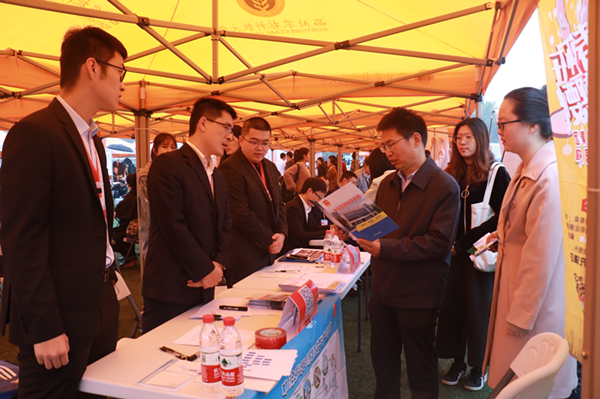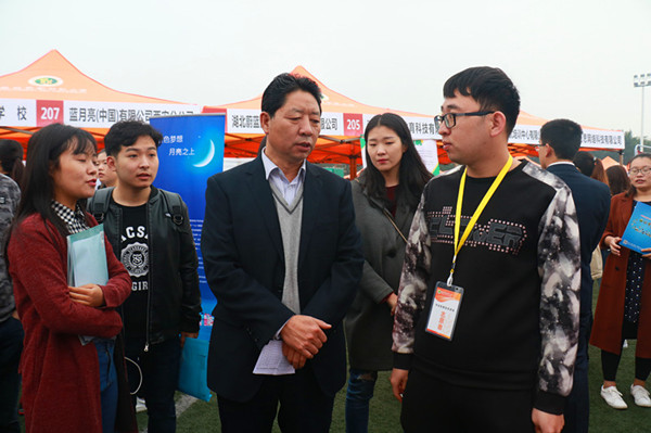 10月14日上午,2019届毕业生秋季洽谈会在南校区田径场顺利举行,本次洽谈会共计360余家单位来校招聘,提供20000余岗位。公司党委书记张振华、副经理王云阳以及全体分管就业辅导员到场了解招聘企业情况并看望求职毕业生。