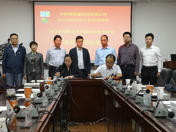 中陕核工业集团公司,成立于1955年,其前身为核工业西北地质局,是我国最早成立的铀矿地质专业队伍之一,为我国的国防建设和经济社会发展做出了重要贡献。近年来,中陕核集团积极深化企业改革,形成了以“地质勘查开发与核能利用”和“健康医疗服务与生物科技”为两大主业,在杨凌投资近亿元,建设辐照处理中心,着力开展高能电子束辐照技术在农业上的应用及开发。徐怀德教授带领果蔬贮藏与加工团队和中陕核工业集团-核盛科技有限公司多次交流,双方初步商定开展高能电子束在农产品贮藏保鲜,加工处理,杀虫灭菌,食品质量安全控制等领域的合作,并计划成立高能电子束农产品加工研究中心。