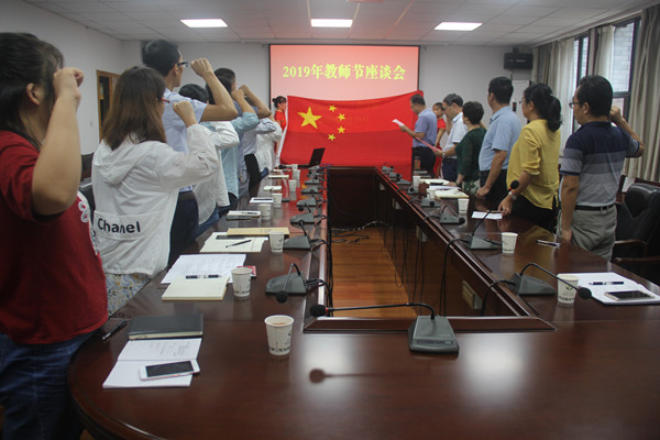 座谈会上,新进教职工分别进行自我介绍,谈了参加工作的感受。为使新职工更好的融入工作,专家前辈纷纷对新教工提出中肯的建议和教学上的要求,希望新教工能以身作则,言传身教。殷切叮嘱后,在樊明涛教授的带领下,参会教师面对国旗、举起右拳、郑重宣誓:“我志愿成为一名人民教师,忠诚党的教育事业,遵守国家法律法规......”,这是履行教师职责的承诺,更是对公司教育事业奉献力量的决心体现。