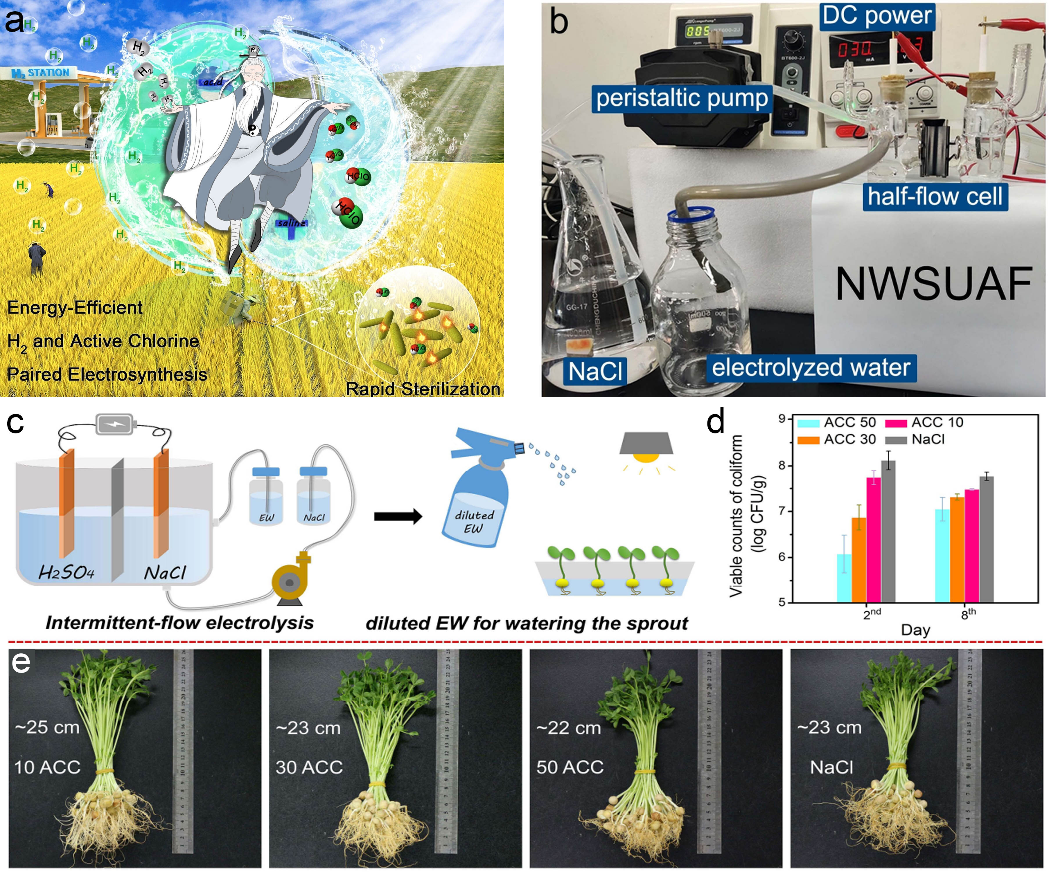 图c: 利用该装置制备活性氯电解水应用于豌豆苗生产示意图;图d: 活性氯电