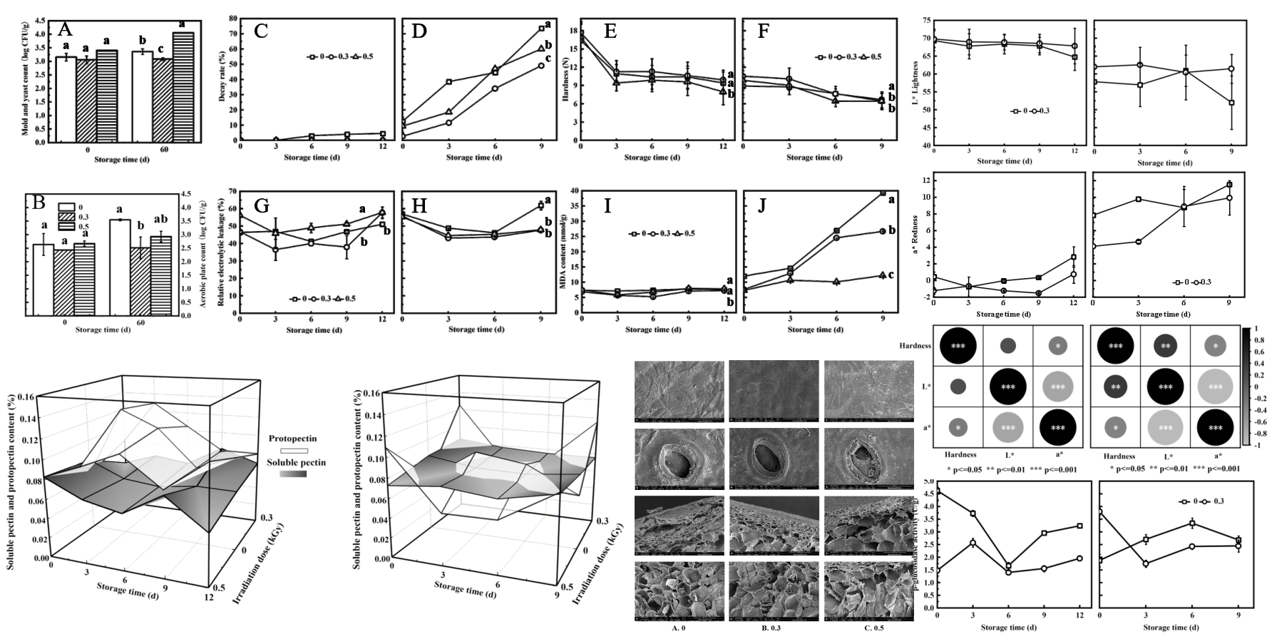 0.3 kGy X射线在显著抑制8.20%的真菌和29.12%好氧细菌生长的情况下,有效地降低了多聚半乳糖醛酸酶(PG)、纤维素酶和β-葡萄糖苷酶(β-Glu)活性,使得果胶分解被抑制。同时使冬枣果皮结构和气孔形态维持完整,角质层保持致密光滑,外表皮细胞排列整齐,大小均匀,亚表皮结构明显,细胞膜透率和产生的丙二醛含量降低,失水软化情况得以缓解。研究结果证明了X射线在冬枣保鲜中的潜力。研究成果“X-ray irradiation - nonthermal processing and preservation of fresh winter jujube (Zizyphus jujuba mill. cv. Dalidongzao)”发表在《Innovative Food Science & Emerging Technologies》上。硕士研究生郭晓宏为第一作者,寇莉萍副教授为通讯作者,365英国上市公司官网为第一单位。