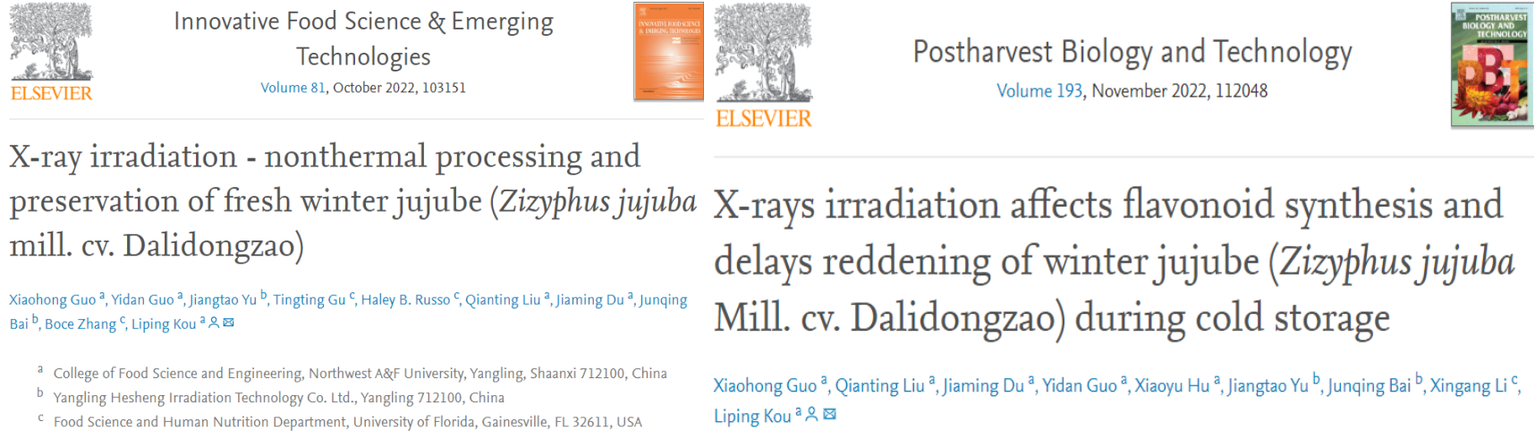 近日,公司果蔬贮藏与加工团队寇莉萍副教授课题组与杨凌核盛辐照技术有限公司合作开展的项目“电子束辐照保鲜冬枣技术研发”取得新进展,研究成果相继在国际食品期刊《Postharvest biology and technology》《Innovative Food Science & Emerging Technologies》上发表。