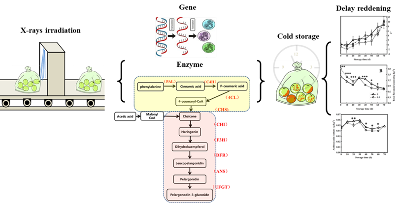 研究表明,在0.3 kGy X射线处理下,冬枣中苯丙氨酸解氨酶(PAL)和二氢黄酮醇还原酶(DFR)活性受到限制,MYB转录因子LOC107415776和LOC107404478和bHLH转录因子LOC107407443、LOC107423582和LOC107423649的相对表达量下调,导致花青素和槲皮素合成降低。与减轻的叶绿素降解水平一起延缓了辐照冬枣的转红。本研究证明0.3 kGy X射线在延缓冬枣转红方面具有潜在的应用价值。研究结果“X-rays irradiation affects flavonoid synthesis and delays reddening of winter jujube (Zizyphus jujuba Mill. cv. Dalidongzao) during cold storage”在《Postharvest biology and technology》上发表,硕士研究生郭晓宏为第一作者,寇莉萍副教授为通讯作者。