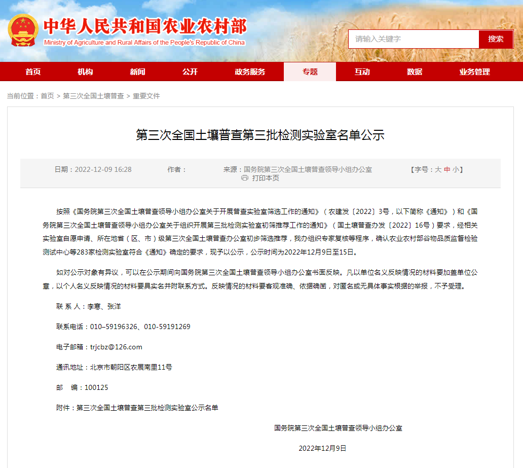 12月9日,农业农村部公布了第三次全国土壤普查第三批检测实验室名单,农业农村部食品质量监督检验测试中心(杨凌)列入全国土壤普查第三批检测实验室名录。