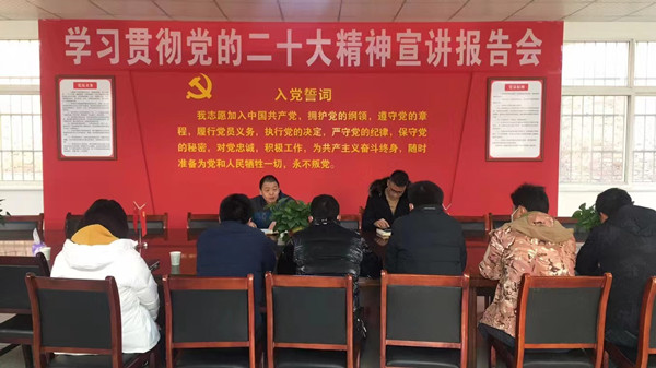 在崔家寨村,五联一抓工作队成员、村两委干部、党员代表、村民代表和筹建中的崔家寨村新农人乡村振兴产业联盟成员企业济济一堂,共同学习党的二十大精神。公司五联一抓工作队副队长欧阳韶晖领学、宣讲。他介绍了二十大召开的概况,习近平总书记所做的二十大报告的主题、文本结构和主要内容。重点领学了二十大报告中有关乡村振兴的篇章。欧阳韶晖指出,学深悟透党的二十大精神、落实党中央关于全面推进乡村振兴的重大决策部署,要体现在和地方实际相结合,既要敢为人先,又要稳扎稳打,通过新农人联盟的建设,助力崔家寨村五联一抓和乡村振兴。