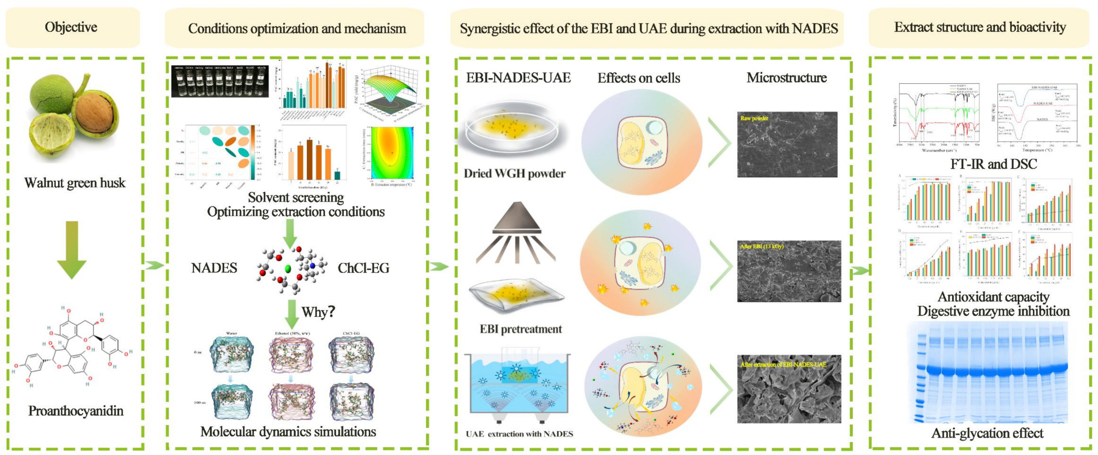 核桃青皮为核桃的外果皮,是核桃加工的主要副产物,含有丰富的多酚、黄酮类化合物、萘醌和多糖等,其中的原花青素(PAC)是一种强大的天然抗氧化剂,能够预防多种疾病。相比传统有机溶剂,天然低共熔溶剂(NADES)不仅环保安全,还可以根据目标产物进行针对性设计提取。为此,本研究开发了一种电子束辐照(EBI)结合超声(UAE)辅助NADES提取的方法,以实现从核桃青皮中绿色高效地提取原花青素。