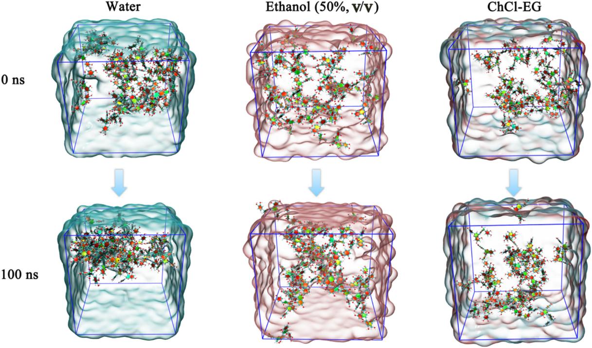 此外,本研究采用分子动力学模拟创新性地探索了溶剂与PAC之间的分子间相互作用。NADES和PAC分子之间形成了更高的SASA值、更多的氢键数量、更长的氢键寿命以及更低的分子间相互作用能。这可能是提高提取效率和稳定性的关键机制。同时,提出了EBI和UAE协同提升提取效率的可能机制。具体而言,EBI预处理的离子化效应增加了WGH的组织孔隙率和溶剂渗透性,超声过程的空化效应加速了PAC从细胞中的溶出,从而使得基于NADES的独特亲和力实现了PAC的有效提取。