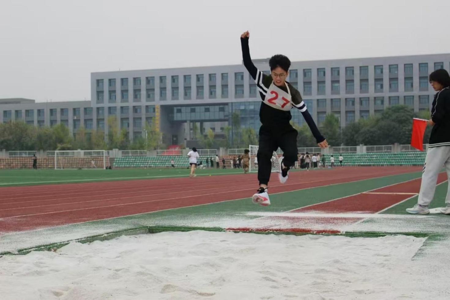 早上的开幕式伴随着绵绵细雨,却无法浇灭所有人的热情。场务人员冒雨高效完成工作,运动员在雨中奋力拼搏,观众在看台上拼命加油助威。早上进行的100m,200m,400米预赛上,4x100m和800m比赛上,运动员们奋勇争先,枪声一响,为自己和班级的荣誉,即使力竭也要拼搏到最后一刻,铅球和跳远比赛中,掷出铅球的优美弧线与次次奋力跳入沙坑的身影,展示出良好的精神风貌和竞技水平!