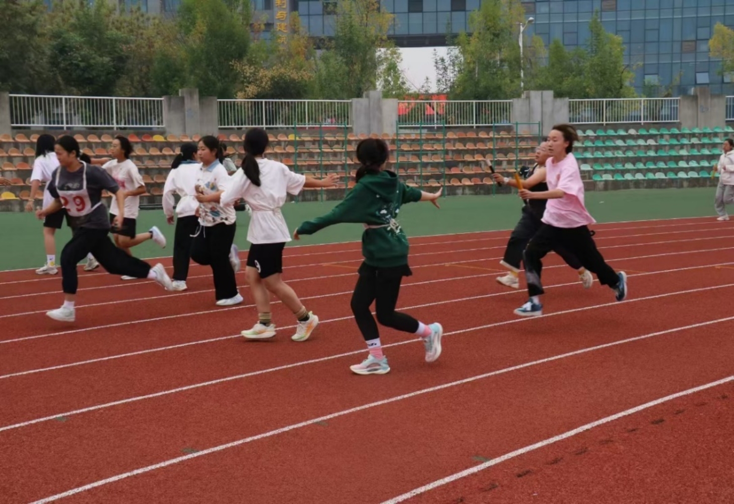 随后进行的袋鼠跳,两人三足,跳大绳以及背夹球等妙趣横生的趣味项目,也引得田径场上的阵阵欢呼。