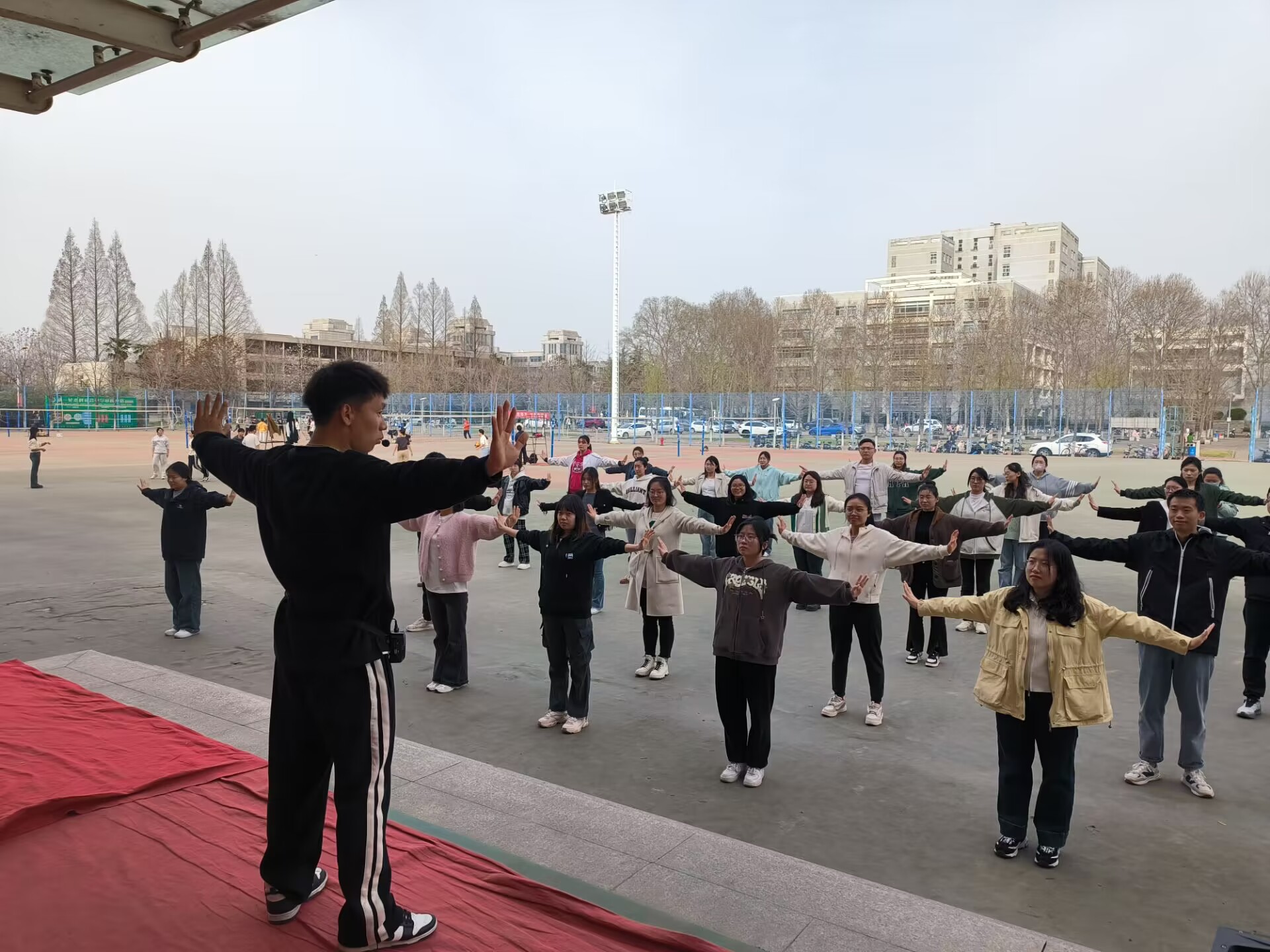在热身运动后,霍老师边讲解边示范,从动作要领到呼吸配合,都一一为师生们演示。师生们认真聆听,仔细模仿,逐渐掌握了八段锦的基本动作。伴随着悠扬的音乐,大家动作由僵硬到连贯,呼吸自然流畅,展现出了八段锦的韵律美和养生功效。