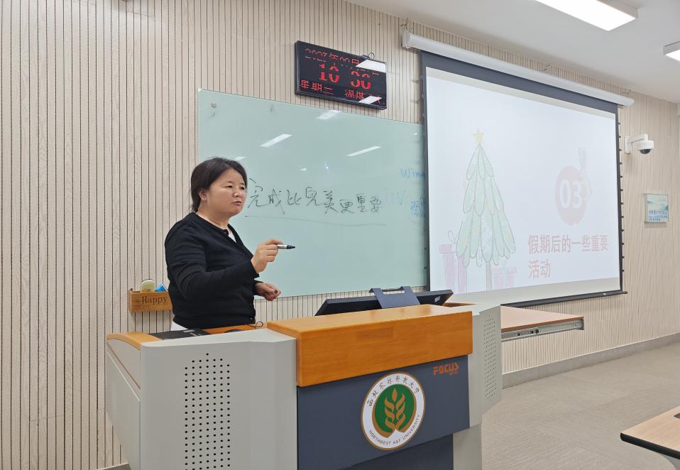 最后班主任陈香维讲话,班主任在讲话中强调应当保持每个人的性格色彩,以宿舍为单位互相学习互相上进,进而一同学习,一同向前,一同担当。同时,个人要管理好自己的学习、生活、健康。以身体为本,努力学习奋斗。同时,班主任还提到大学与高中时期老师与环境的变化。简述个人应该以自己的意愿、兴趣对活动进行选择。做到通识,对信息也有所取舍。表明“完成比完美更重要”的观点,对作业以及上课的氛围和态度提出要求,注重平常任务的完成,学习方法的调整,学习能力的培养。最后班主任为同学们分享在公司解压的方法,关心同学们的心理健康。并对如何建立学习计划提出了“由大化小,由繁化简”的方法,同学们受益匪浅。