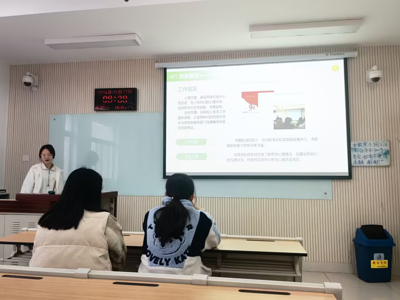 班会主要总结了三个部分,分别是班级建设、学风建设和未来目标。张楠春对班级在文艺、体育等方面取得的成绩表达了肯定,并提出相应建议,鼓励班级成员继续为班级荣誉而努力。