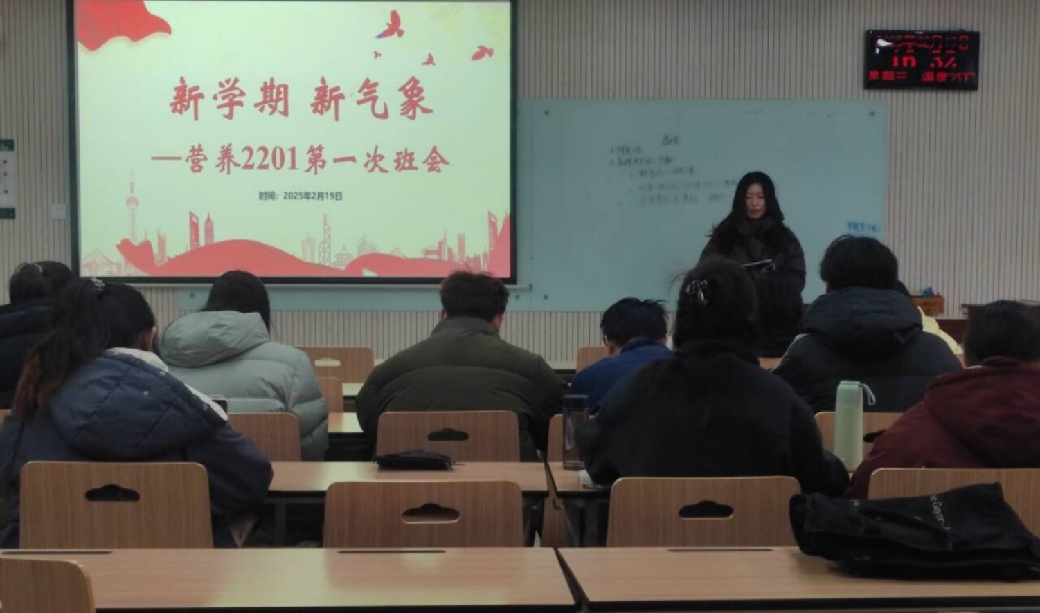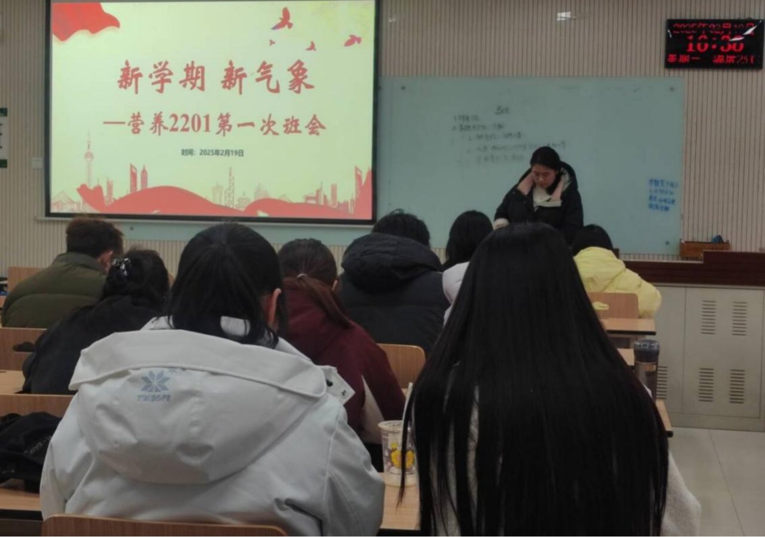 为对上一学期班级工作进行总结,2025年2月19日上午,营养2201班以“班会启航新学期,安全学业双保障”为主题,成功召开了一场意义深远的班会。会议由班长李超然同学组织,张平林同学主要总结了班级学习情况,张琬晶同学负责班级活动和宣传工作汇报。