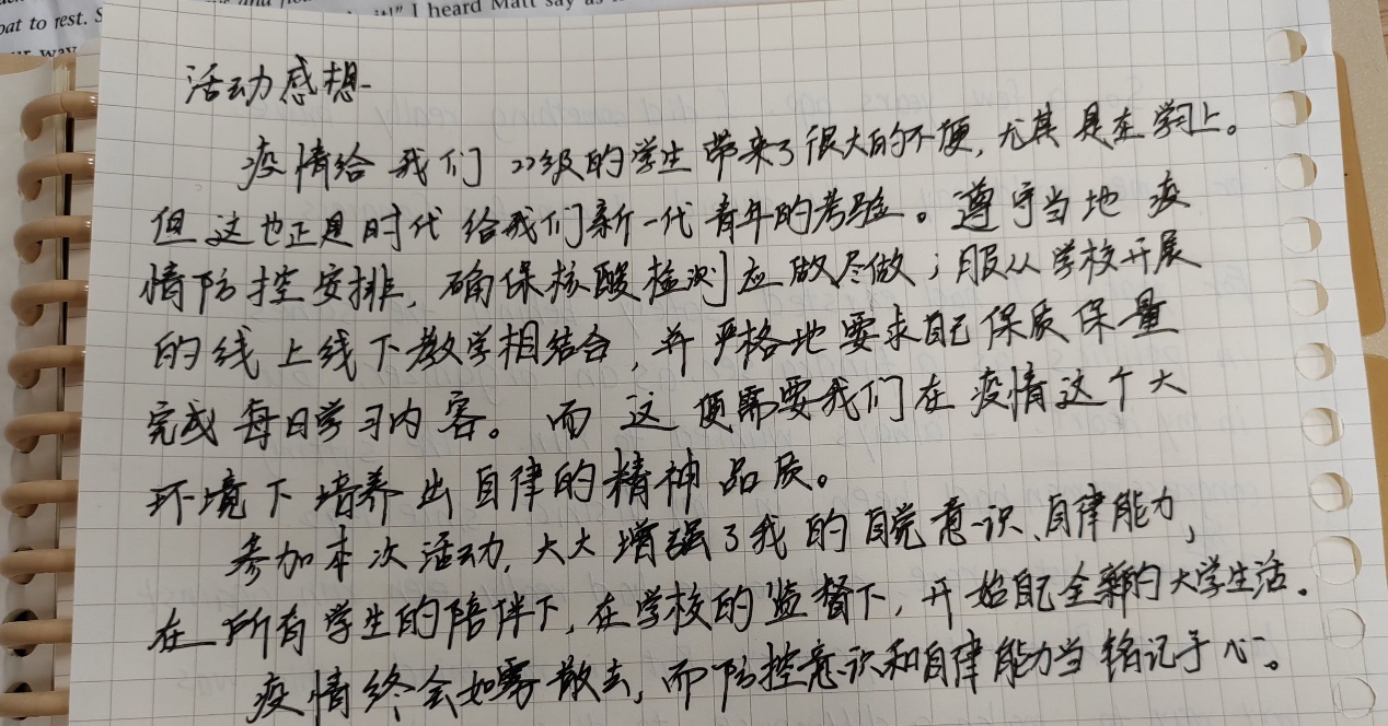 来自营养2201的杨语晨同学在谈到此次活动感想时说到:“疫情下的生活与学习不比往日轻松,却磨砺了我的心性,让我在疫情中学会自立自律,平衡好学习与生活,做好自己的时间管理大师。”