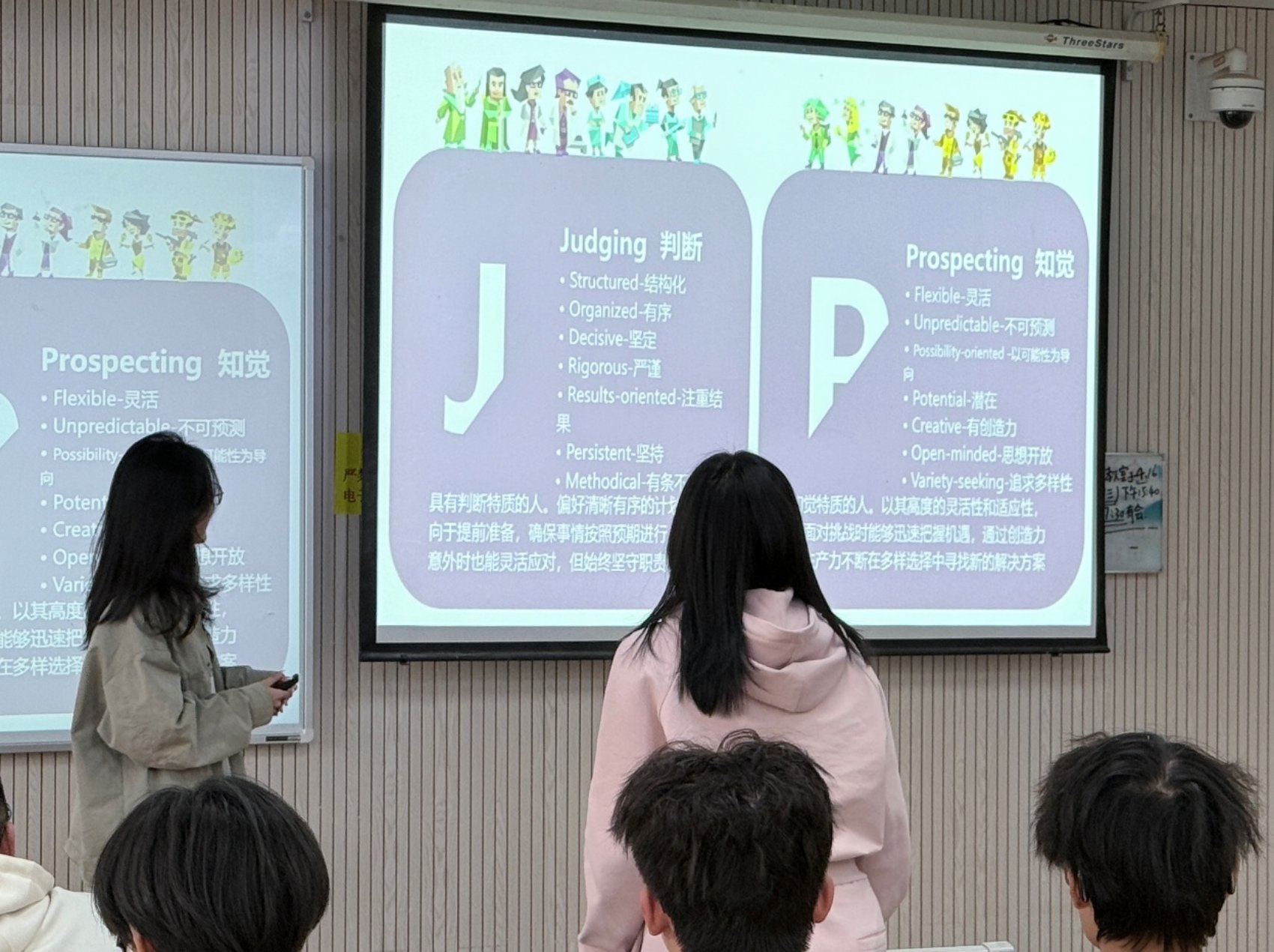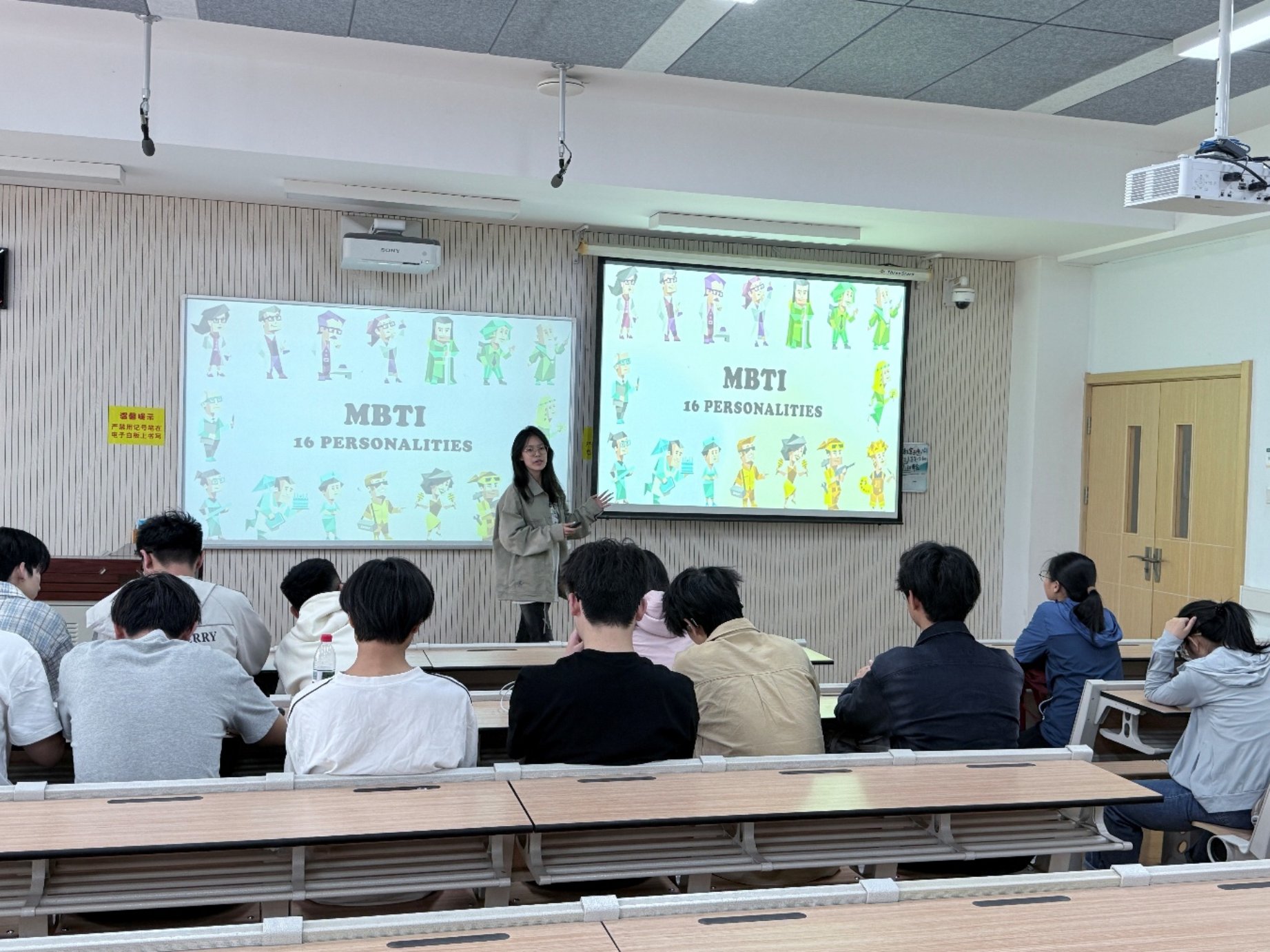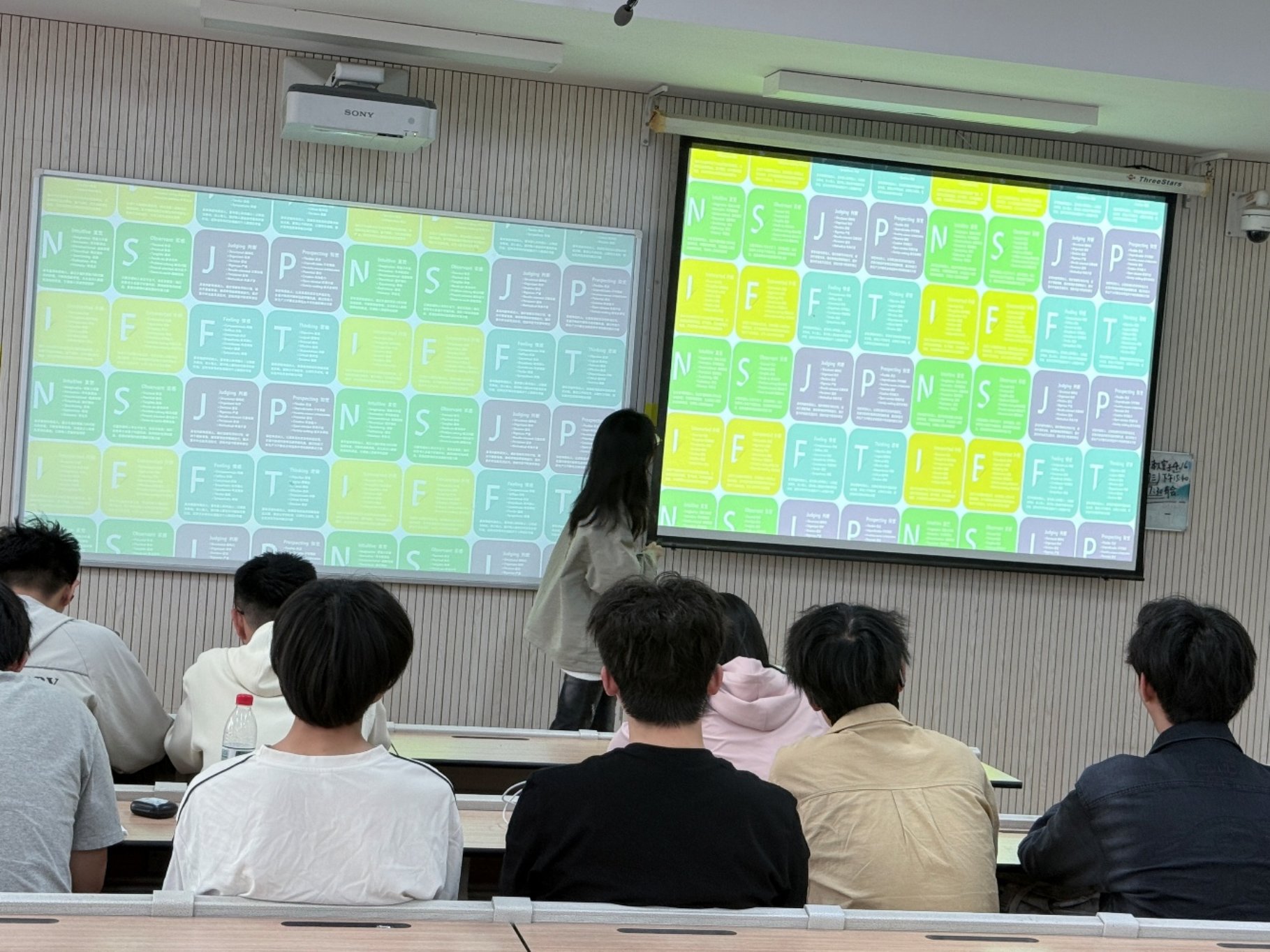 在分享环节,杨佳乐同学走上讲台,分享自己的MBTI测试结果——ENFP。她结合自身经历解读道,作为ENFP,在团队合作中总能迸发出新奇想法,擅长用热情感染大家,从宏观角度规划任务,注重调动团队成员积极性、促进沟通。她还提到,测试结果让她更清晰地认识到自己在人际交往和学习生活中的行为模式,也明确了未来改进的方向。杨佳乐生动真诚的分享极具感染力,赢得同学们阵阵掌声,也让大家对MBTI人格测试的实际应用有了更直观的认识