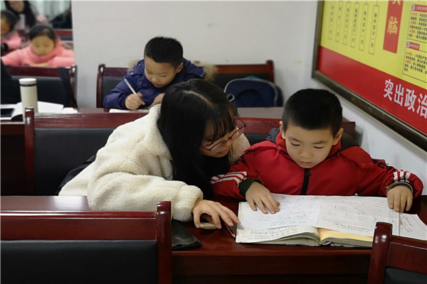 志愿者为孩子们检查作业