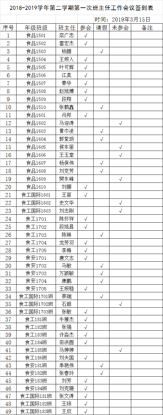为切实加强班主任队伍建设,完善考核指标,公司决定对班主任例会到会签到情况纳入考核并进行通报。现将2018-2019学年第二学期第一次班主任例会到会签到情况通报如下: