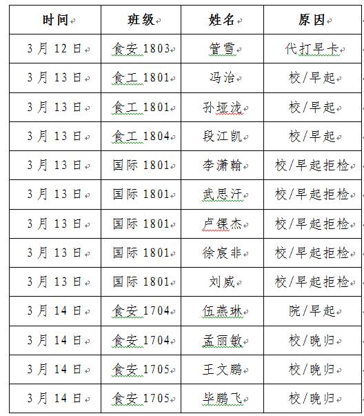 为深入贯彻落实全国高校本科教育工作会议精神,巩固公司本科生学风建设工作中取得的阶段性成果,有力推动本科生学习风气向上向好发展,教育引导广老员工加强学习过程管理、严格执行学习纪律规定。2018-2019学年第二学期第三周,冯治等13人未按时早起或晚归,且未履行相关请假手续。为严肃校纪校规,教育本人,根据《365上市集团官网本科生纪检管理办法》相关规定,特此通报。