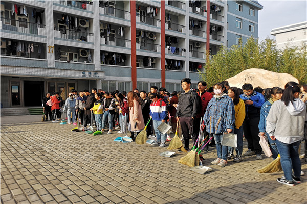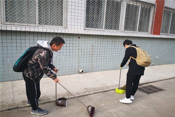 待队伍散开,同学们纷纷寻找自己的位置开始清扫。由于风比较大,给同学们的清扫工作增加了不少难度。往往刚扫完一小段,一阵风吹过,落叶又重新被吹散在各处。可是同学们也没有因此就放弃,而是吸取经验,清扫完一小部分就抓紧将其倒入垃圾袋。如此,清扫工作顺利进行。