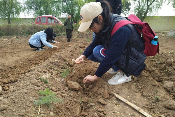 最后来到了第三步,这一部分是田园使者们的“重头戏”——一方面,由两位男队员在松土后使用“人拉犁”进行行距的划分;另一方面,负责人找到路边的几根小树枝撇成24厘米的长度,由女队员们根据枝丫长度控制株距,在犁地后的小沟壑中每隔24厘米种植两颗玉米种子,种植的队员们身后还跟着另一批队员用脚将土地平整,将种子埋起来。这样的男女搭配、分工合作让种植过程井然有序,并且田园使者们也感受到了合作的乐趣。