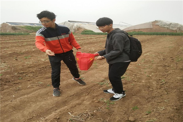 本次活动的主要内容是为玉米田施肥。合作社的张叔叔告诉队员们,这片田是玉米和猕猴桃交叉栽种,猕猴桃喜阴,玉米田可以为猕猴桃提供阴凉的环境,有利于猕猴桃生长。紧接着,张叔亲身为我们演示了如何施肥:提着装有肥料的篮子或袋子,先抓一把肥料在手里,再分两次匀速洒出。播撒肥料时务求施肥均匀,因为区域施肥密度过大,反而不利于玉米生长。同时还要避免把肥料洒在猕猴桃苗上,做到专肥专用。