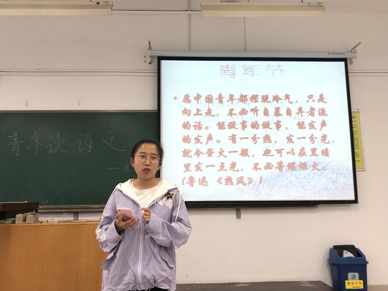 同学们朗读分享的诗文各有意蕴,皆围绕“爱国精神”和“珍惜青春”的主题并结合自我的经验进行了感悟分享。林思韵同学在朗读了《敬告青年》节选后给大家分享了五四运动与新文化运动的意义。五四运动是一次反帝救亡的员工运动,也是新文化运动的结果。而陈独秀先生的《敬告青年》正是《新青年》的发刊词,有着独特的意义。陈独秀先生在结尾提出的勉励:宇宙间之事理无穷,科学领土内之膏腴待辟者,正自广阔。青年勉乎哉!在当下依旧有着启迪与引领力。