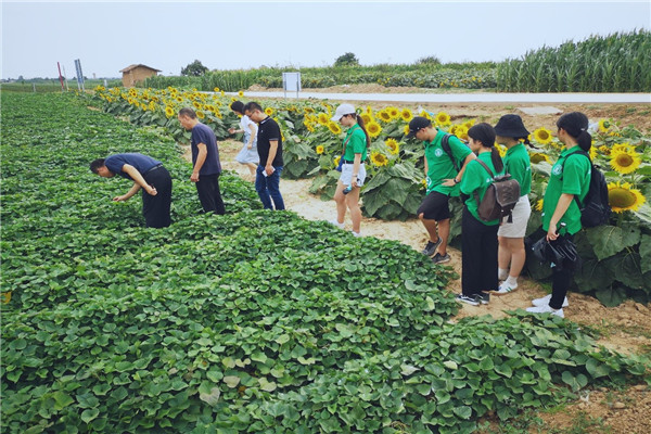 2019年7月15日上午8点整,调研队到达了合阳曙光红薯西休扶贫产业园区。金黄的向日葵,一望无际的菜田,还有路两边不熟悉的作物,无一不吸引着从城市初来乍到的队员们。