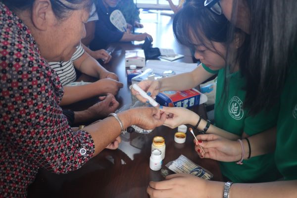 报告会结束后,服务队为现场的村民们测实时血糖,其中大部分村民实时血糖都在正常范围内,只有极少数的村民血糖偏高,通过详细询问每一位测量者的早饭时间结合测量结果,给出具有针对性的饮食建议。村民们十分满意,表示自己在此次活动中得到了实实在在的好处。其中一位老奶奶笑容满面地说道:“俺们这些老年人啊平时身体老有大大小小的毛病,像俺常年高血压,还要经常去医院抓药,花钱又受罪,感谢今天教授和娃儿们的讲解,以后俺会注意饮食,不吃那么多西瓜嘞!”